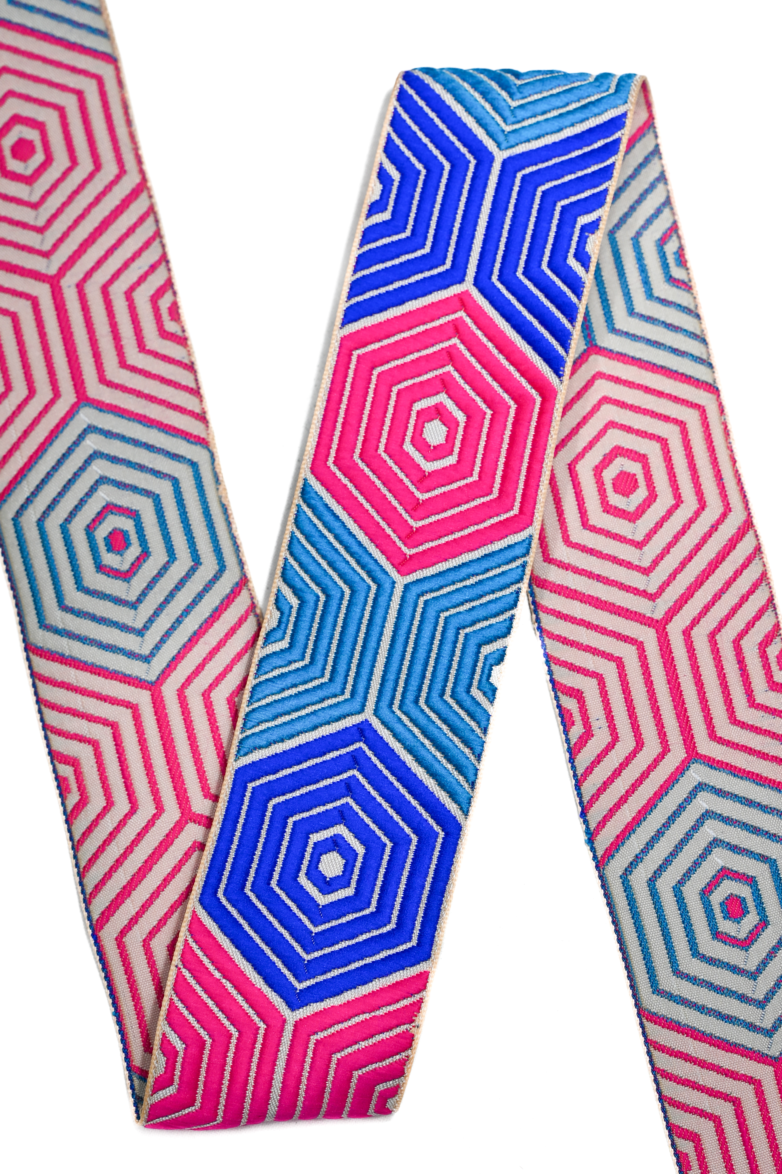 Dette vevde pyntebåndet gir deg en ekstra touch av eksklusivitet og med heksagonmønsteret får du et moderne og geometrisk uttrykk som passer perfekt som belter, eller veskestropper. De levende fargene gir en livlig og energisk følelse.