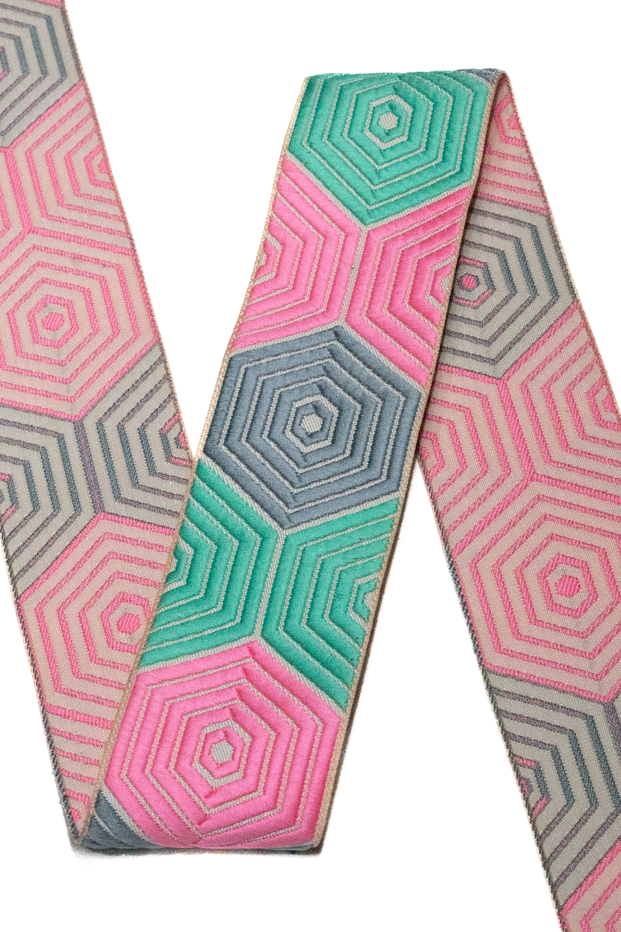 Dette vevde pyntebåndet gir deg en ekstra touch av eksklusivitet og med heksagonmønsteret får du et moderne og geometrisk uttrykk som passer perfekt som belter, eller veskestropper. De levende fargene gir en livlig og energisk følelse.
