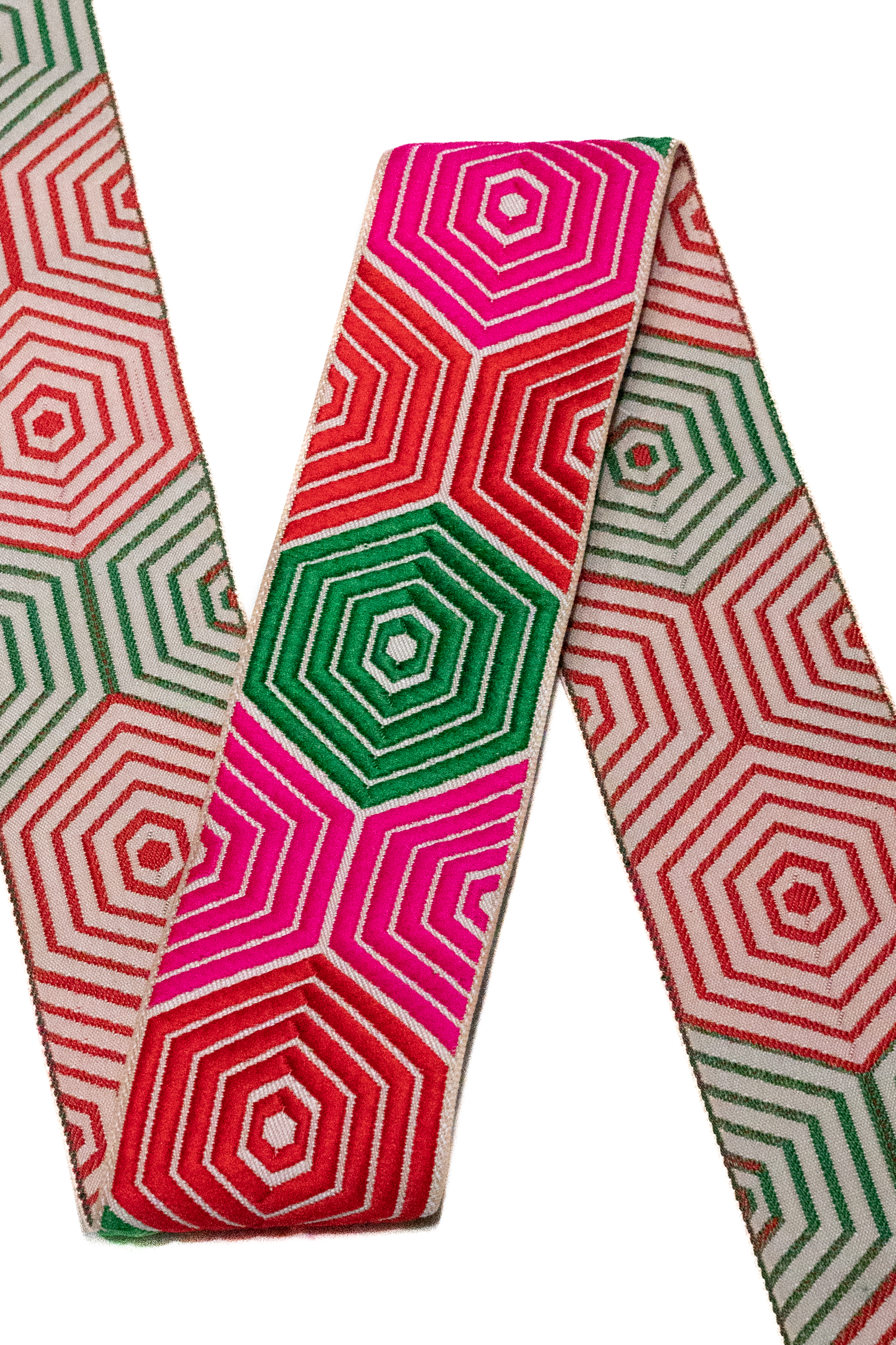 Dette vevde pyntebåndet gir deg en ekstra touch av eksklusivitet og med heksagonmønsteret får du et moderne og geometrisk uttrykk som passer perfekt som belter, eller veskestropper. De levende fargene gir en livlig og energisk følelse.